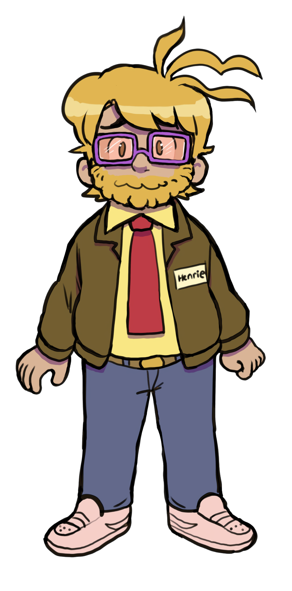 - The nametag on his jacket reads "Henrie", which is unintentionally misspelled. He pretends he doesn't notice.