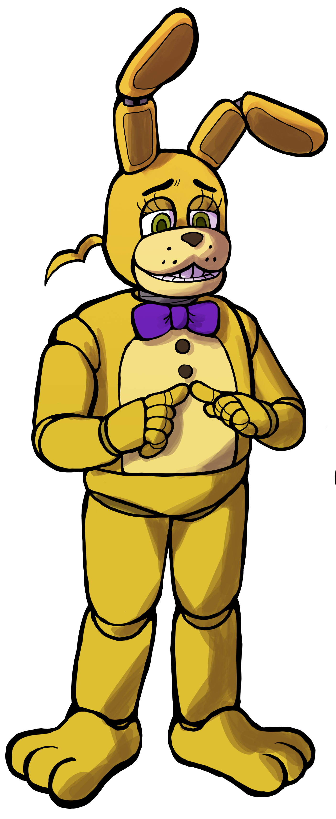 Spring Bonnie is a major character in BlueyCapsules. He is one of the original two animatronics (along with Fredbear) created for Fredbear's Family Diner, and was created by William Afton. He is a hybrid springlock animatronic, meaning he can both function as an animatronic and a suit when his internal mechanical parts are held back by fastened springlocks. Like Fredbear, he is also a pretty big stoner, but he is notoriously more jittery and anxious.
